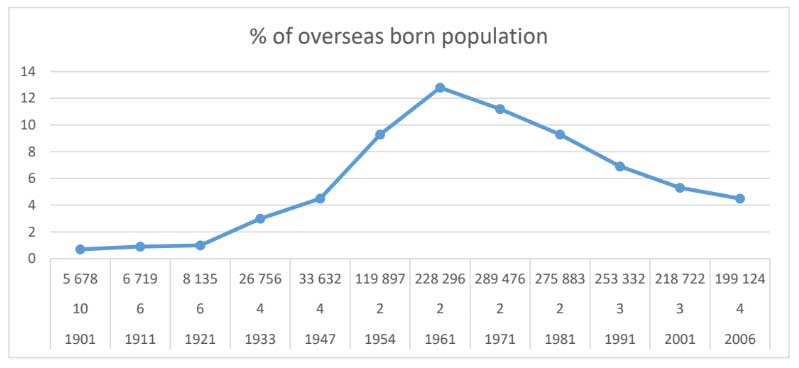 In 1881, census figures recorded fewer than 2000 Italians living in Australia. As the following tables show, the number of Italian immigrants increased significantly from the end of WWII, to become the second highest country of origin for new immigrants behind England and Ireland, in the 1950s, 60s, 70s and 80s, although the peak was during the 1960s.